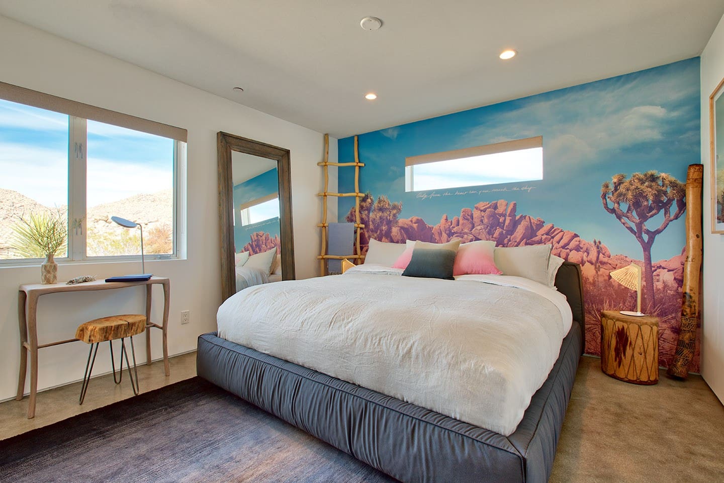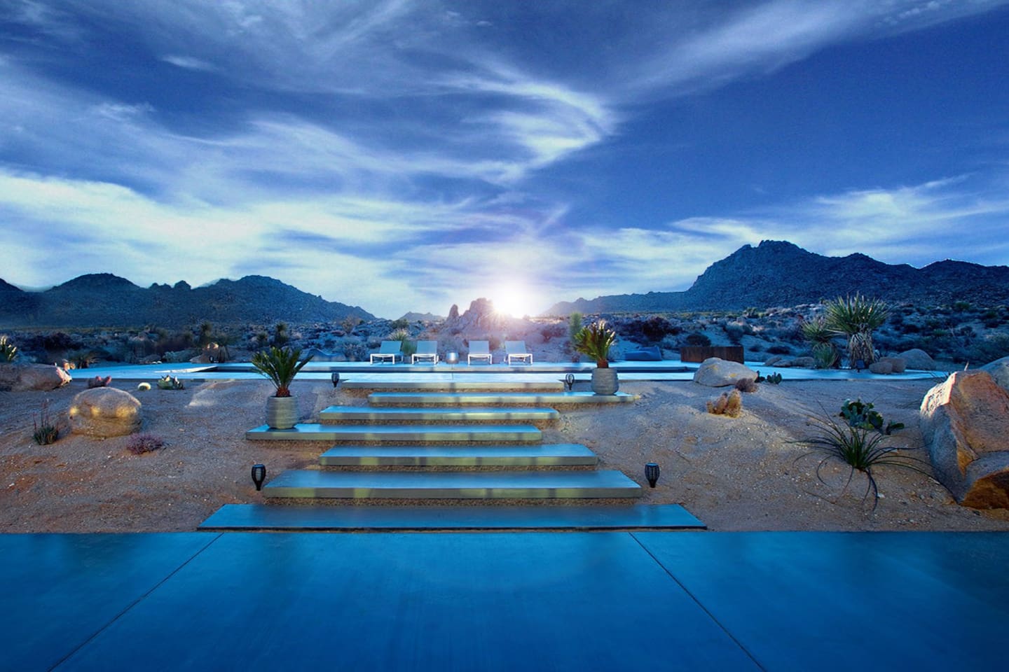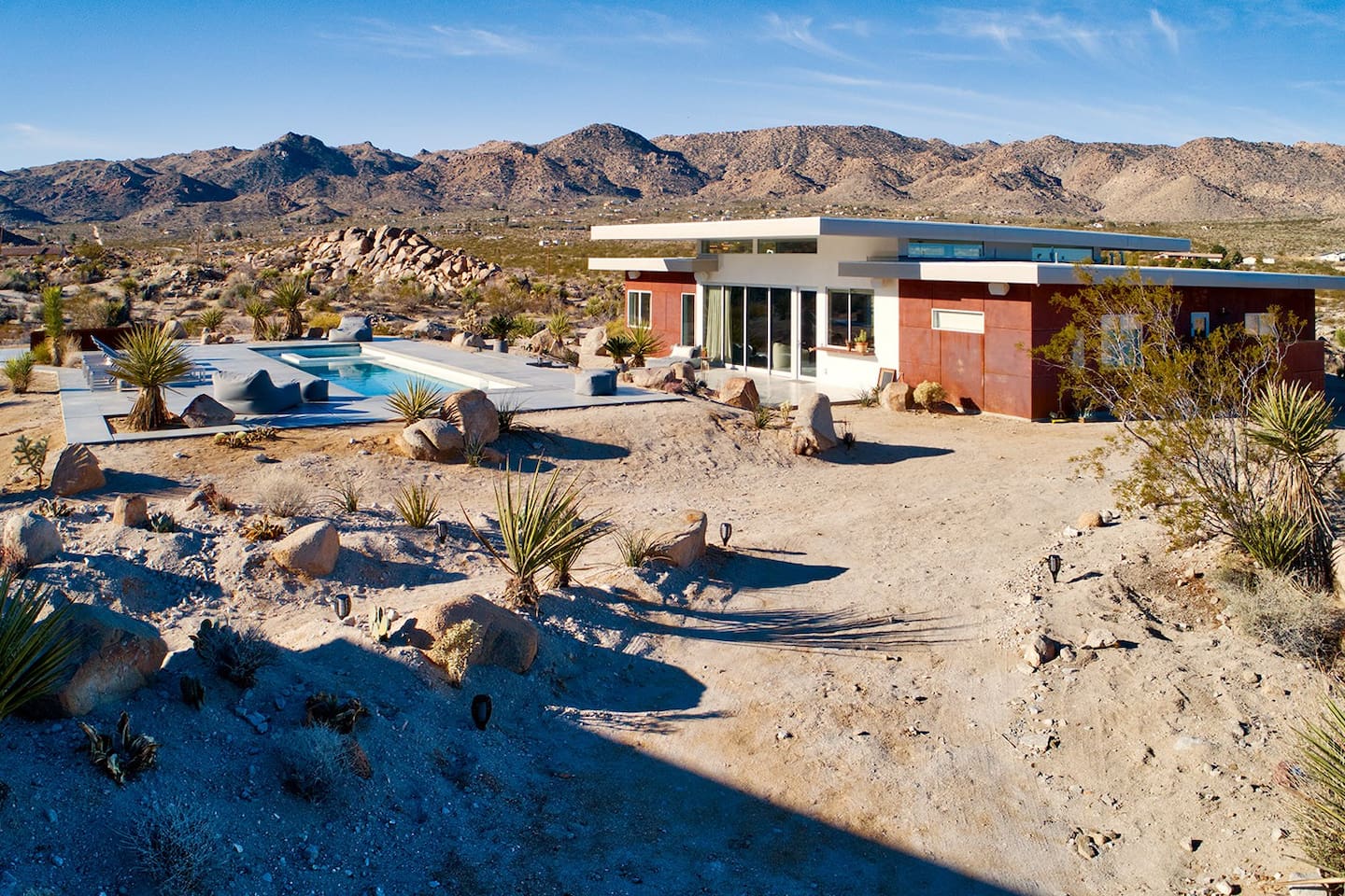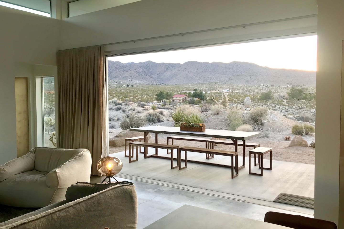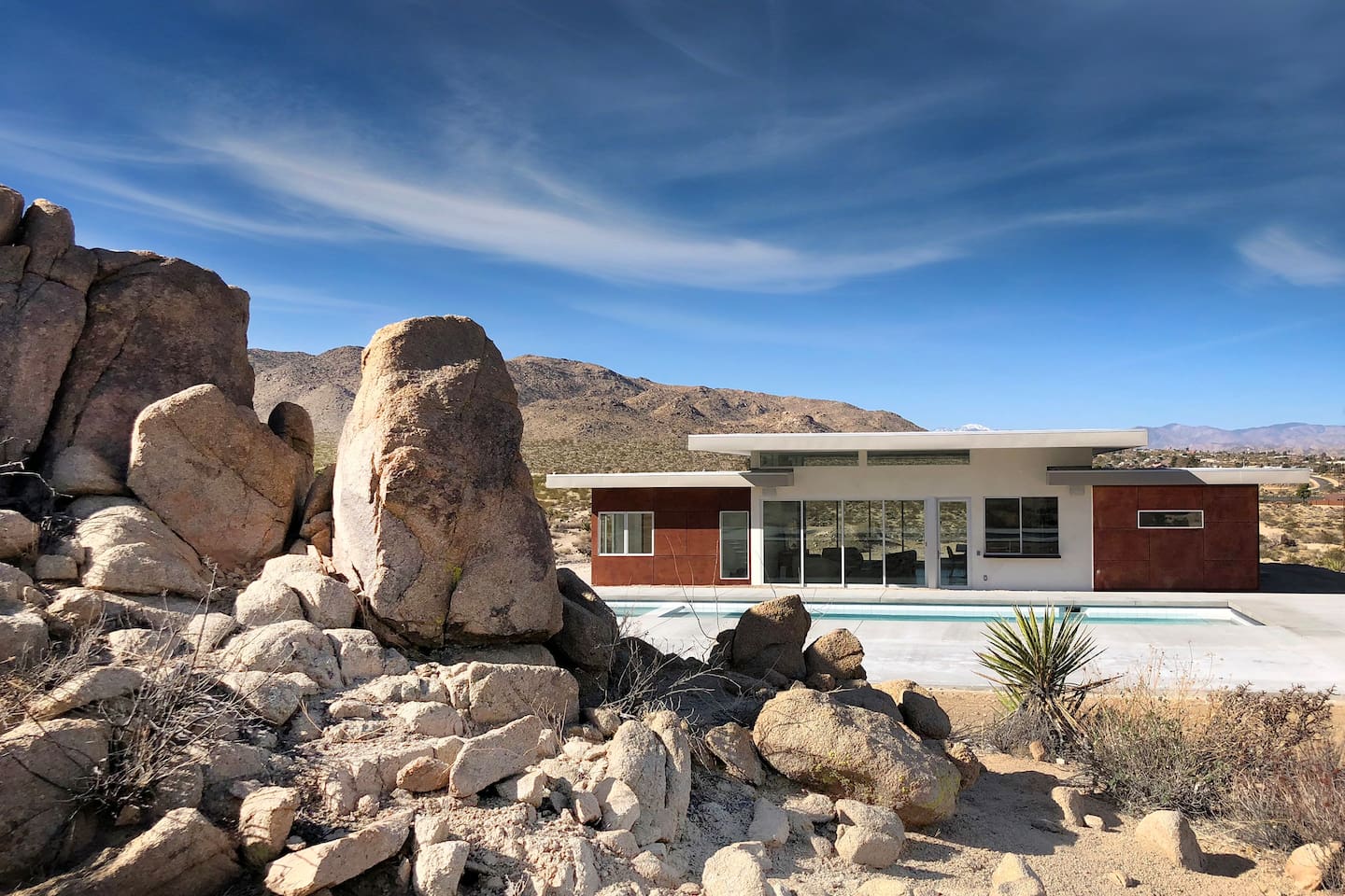 SkyHouse sets a new standard for the high desert. This signature architectural and inspirational hideaway is perched on 8 private acres in the heart of Joshua Tree. Enjoy spectacular views from the heated pool, outdoor shower, and indoor living room, with Joshua Tree National Park literally on your doorstep. SkyHouse is the collective expression of lifelong friends with a passion for the desert, for art and for living well. We hope our home provides you with the same sense of awe we experience each time we visit Joshua Tree. A perfect fusion of Wabi Sabi and modern design, SkyHouse features all the comforts of city living while retaining a deep connection to the surrounding desert and all its natural beauty. Soaring rooflines cap walls of sliding glass to ensure you’re always connected to the outdoors, even when nestled in the comfort of multi-zone climate controls. ☆☆ HIGHLIGHTS ☆☆ ✹ Stunning 1500-square-foot single-story villa on 8-acre private estate ✹ Winner of the Dwell Design Award (2019) ✹ Featured in TV, Film and Global Ad Campaigns ✹ 3 elegant bedrooms w/ custom murals + king beds ✹ Linens by Matouk and Frette ✹ 2 full bathrooms; luxury toiletries provided ✹ Full kitchen w/ modern appliances ✹ Oversized kitchen island w/ seating for 6 ✹ Open-concept living area w/ direct access to outdoor dining + pool ✹ 65” HDTV w/ access to popular streaming platforms ✹ High-speed wifi w/ speeds up to 43 Mbps + dedicated workspaces ✹ Wireless Sonos sound system throughout the home + outside spaces ✹ Washer + dryer ✹ 1800-square-foot outdoor decks w/ breathtaking desert views ✹ 10-foot outdoor dining table with unobstructed views of the desert ✹ Outdoor saltwater pool (heating available) ✹ Large hot tub ✹ 10’ gas fire pit ✹ Private garage w/ parking for 2 vehicles + twin L2 EV chargers ✹ Pet-friendly ✹ Free walk-on access to explore Desert View Conservation Area (DVCA) of Joshua Tree National park ✹ Exclusive location w/ easy drive to great restaurants + groceries ✹ Commercial production available on request Eager to Read More? Here Are A Few Kind Words From Our Previous Guests: “Gorgeous, peaceful, comfortable house …. We had an amazing time! We mostly loved the proximity to the park , and spending time outside at night , swimming , enjoying the night sky …. Will be back for sure . Thank you for sharing your piece of heaven.” –Raya “We had a fantastic stay at Skyhouse. This home is so comfortable and the scenery is absolutely amazing. We had a great time walking into the national park as well as walking through the garden and lighted path. This is a home that is so well manicured and taken care of. We had such a great time that we didn’t want to leave. I highly recommend skyhouse for your next trip. It will not disappoint! Thank you for a great stay.” –Devon “Wow! We were looking for a beautiful secluded, private house and this place did not disappoint! The scenery was outstanding! If you're an early bird, the sunrises are simply surreal. The hiking from the backyard was fabulous, straight in to the national park. We mainly stayed at the house, only venturing out a few times, because we didn't want to leave our serene oasis in the desert. We cooked most meals at the house. I was very impressed that all the extras were provided, baggies, food wrap, chip clips, spices, coffee, olive oil, honey, sugar, teas, etc. They even provided clothes washing detergent, plenty of paper towels and trash bags. The kitchen was well stocked, all we had to do was get the food items. I have stayed at some Airbnb's that only provided a few things, and you had to go buy a whole container of something you only needed two out of the whole box. The town is not the attraction here, the house and setting is! If you need to recharge yourself this is the place!” —Cara ☆☆ AN INSPIRED DESIGN ☆☆ Nestled on 8 secluded acres overlooking Joshua Tree National Park, the award-winning SkyHouse is an architectural delight. Featured in Architectural Digest, this unique home was inspired by the City Library Bruges and Doug Aitken’s “Mirage” art installation and has been featured in movies such as Andy Samberg’s “Palm Springs”, national ad campaigns, fashion shoots, and music videos. The perfect fusion of Wabi Sabi and modern design, SkyHouse epitomizes comfort, elegance, and luxury – a truly magical location for a special getaway for the discerning desert enthusiast. Guest access: ✹ GENERAL: Guests can enjoy private access to the entire 8-acre estate. ✹ PARKING: Free parking is available for two vehicles in the covered garage. Additional vehicles may be parked in the uncovered driveway. We also have 2 free EV chargers for your convenience. ✹ WORK FROM HOME: There is free, high-speed wifi available throughout the home, plus a designated workspace in the primary bedroom and a comfortable laptop-friendly space in the kitchen. ✹ PETS: Well-behaved pets are welcome. ✹ FILM AND COMMERCIAL PRODUCTION: available on request. Please inquire about rates and availability. Other Things to Note: ✹ Personalized host greeting to help you access the property and get settled. ✹ Heating for the hot tub and fire pit are included in your booking fee. ✹ Pool heating is available during the cooler season. Please advise us in advance of your arrival if you’d like to make use of it. A supplemental fee of $200 per day is charged, due to high fuel costs in this area. ✹ SkyHouse benefits from a unique location, which grants you walk-on access to miles of stunning hiking trails and mountains in the Desert View Conservation Area of Joshua Tree National Park, completely free of charge. ✹ Guests will be required to sign and agree to our house rules, verify their identity, pay our refundable security deposit, and schedule a phone call with our manager. All steps must be completed in full before check-in. ✹ The High Desert occasionally has 