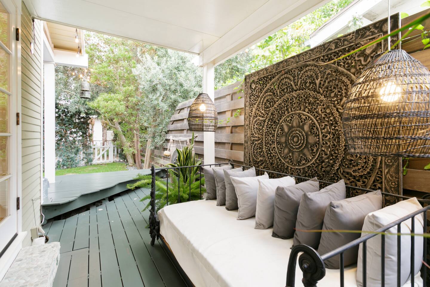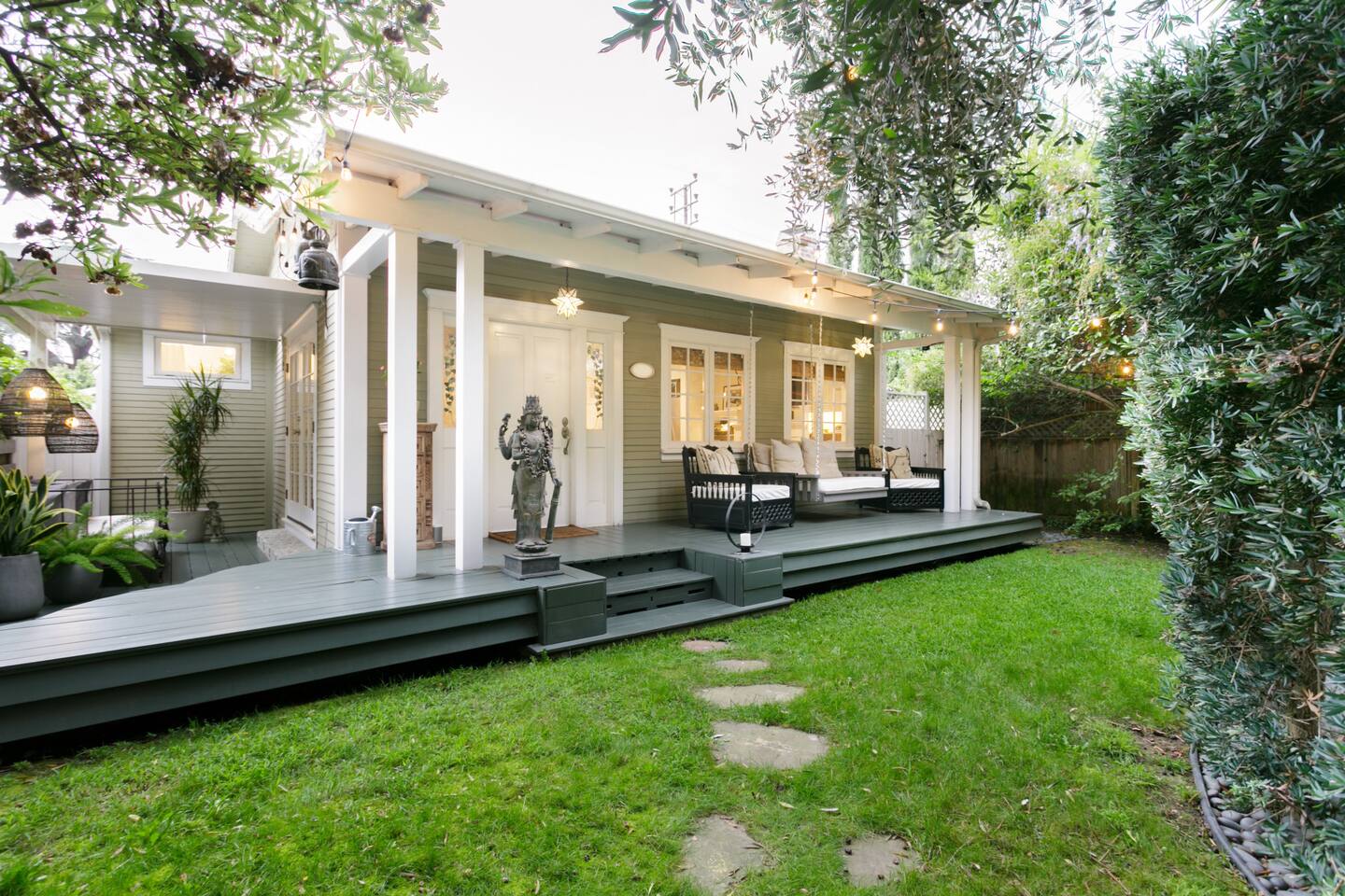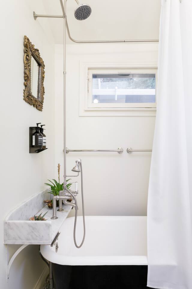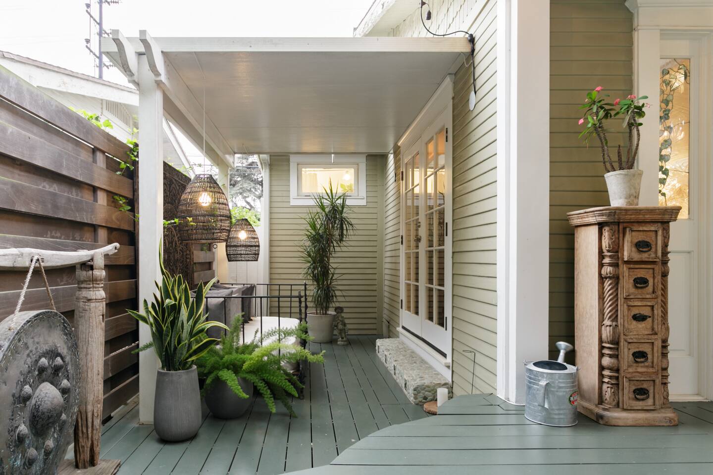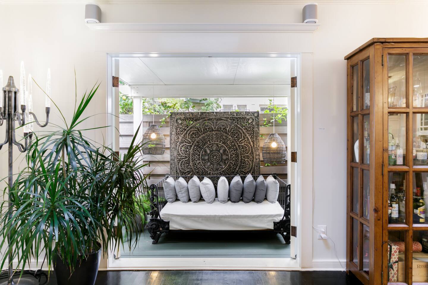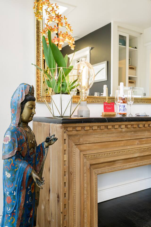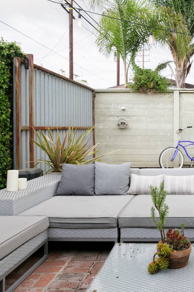This quiet, designer bright & airy romantic bungalow is on the historic Venice Walk Streets. Fully modern open floor plan with chef's kitchen, restaurant-grade espresso machine, 50" flat screen TV, Sonos sound system throughout the property, wi-fi and more. Beautiful grassy front yard on the peaceful tree-lined walk street with hanging porch swing, breakfast table and more. Private rear patio with expansive outdoor seating (perfect for lazy sunny days), 6 person hot tub and extra parking. The space Recently completed six-figure redesign by Venice designer Vanessa Schreiber matches beautiful details with comfort throughout. The Master bedroom has an en-suite bathroom featuring vintage clawfoot tub. The second bedroom is a Moroccan inspired hideaway in a private, romantic 'Cabana' off the rear patio. Not just a rental: this is my home, and features fine art and rare collectibles I’ve acquired from all over the world. I hope you’ll feel the same love and inspiration the Foxden gives me every day. Guest access: As a guest, you have access to the entire property. There is the main house, the cabana, the hot tub, and three outdoor patios that are each uniquely furnished. My home is your home! Other things to note: Please note that Foxden is a quiet, peaceful retreat. Out of respect for our neighbors, no more than 4 people may be on property at any time. Music should be kept at low, respectful levels. Please avoid loud conversation outdoors after 10pm. There are gongs and musical chimes hanging outdoors that I have collected in my journeys. Again, out of respect for our neighbors, please do not sound these at night. Upon booking, you will receive a link with a request to sign and agree to our house rules, verify your identity, pay our refundable security deposit, and schedule a phone call with our manager. Please note that these steps are required for all guests. All steps must be complete in full prior to check-in.